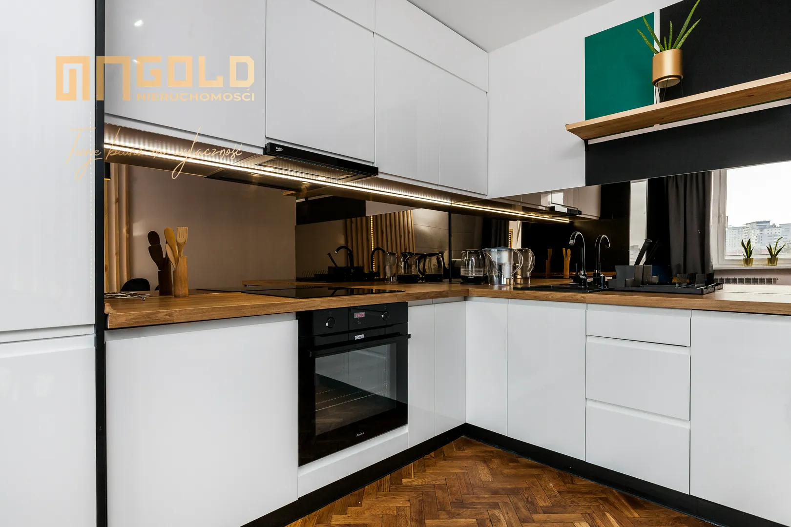 Montaż zabudowy kuchennej z drewnianym blatem i sprzętem AGD