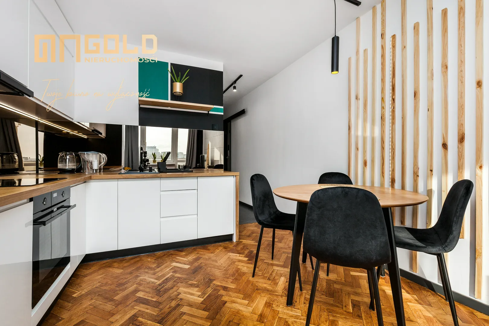 Montaż zabudowy kuchennej z drewnianym blatem i sprzętem AGD