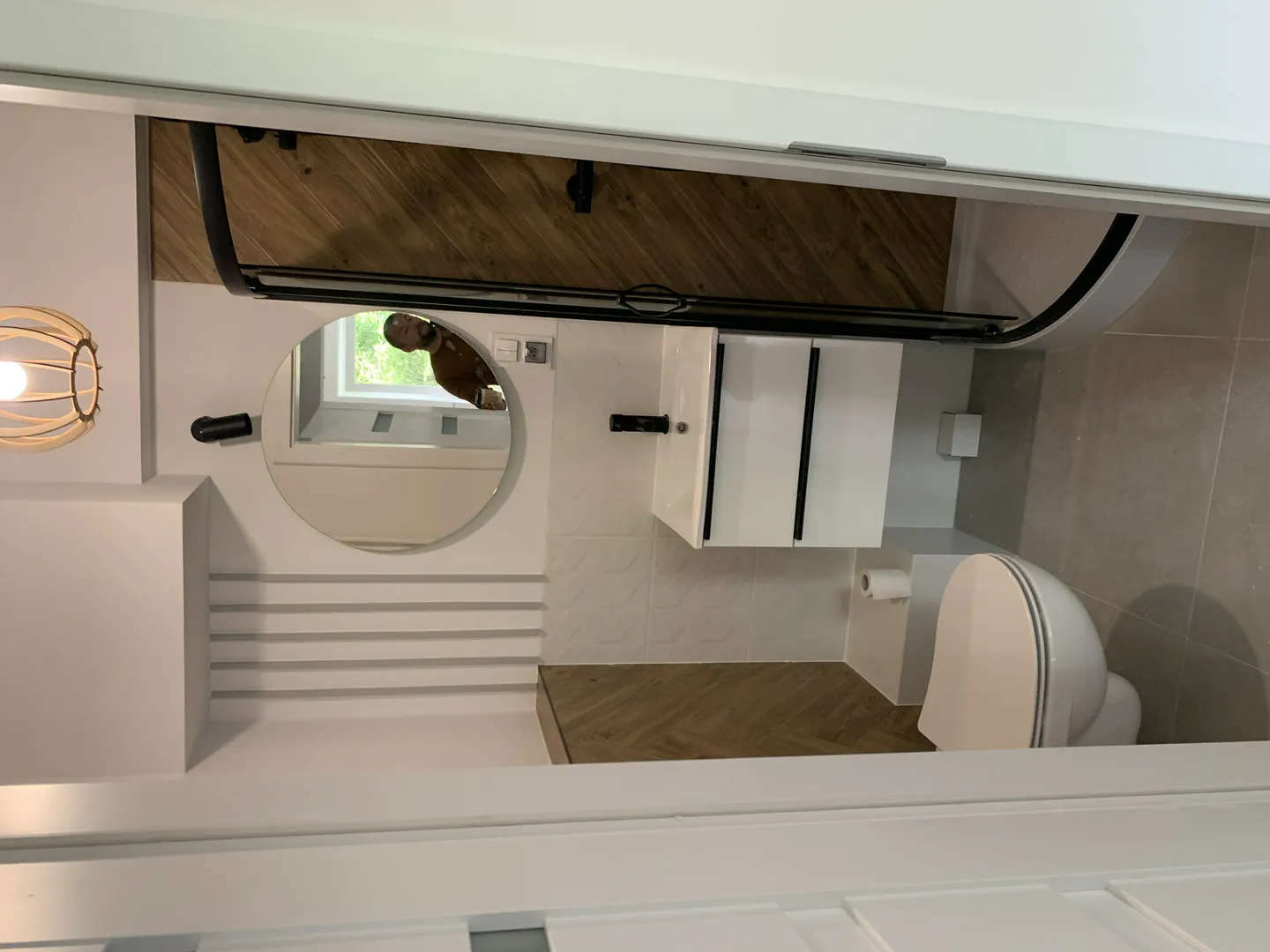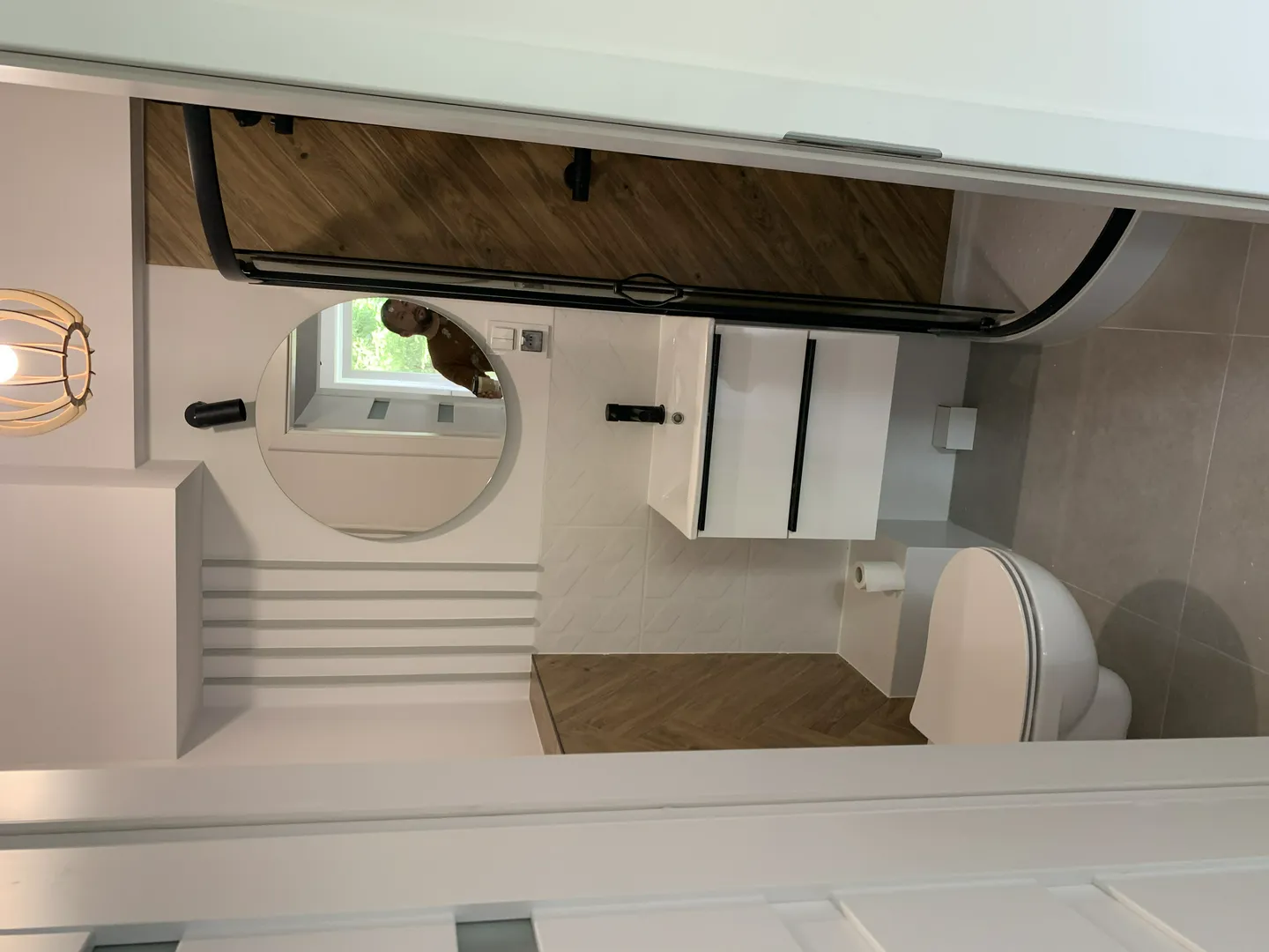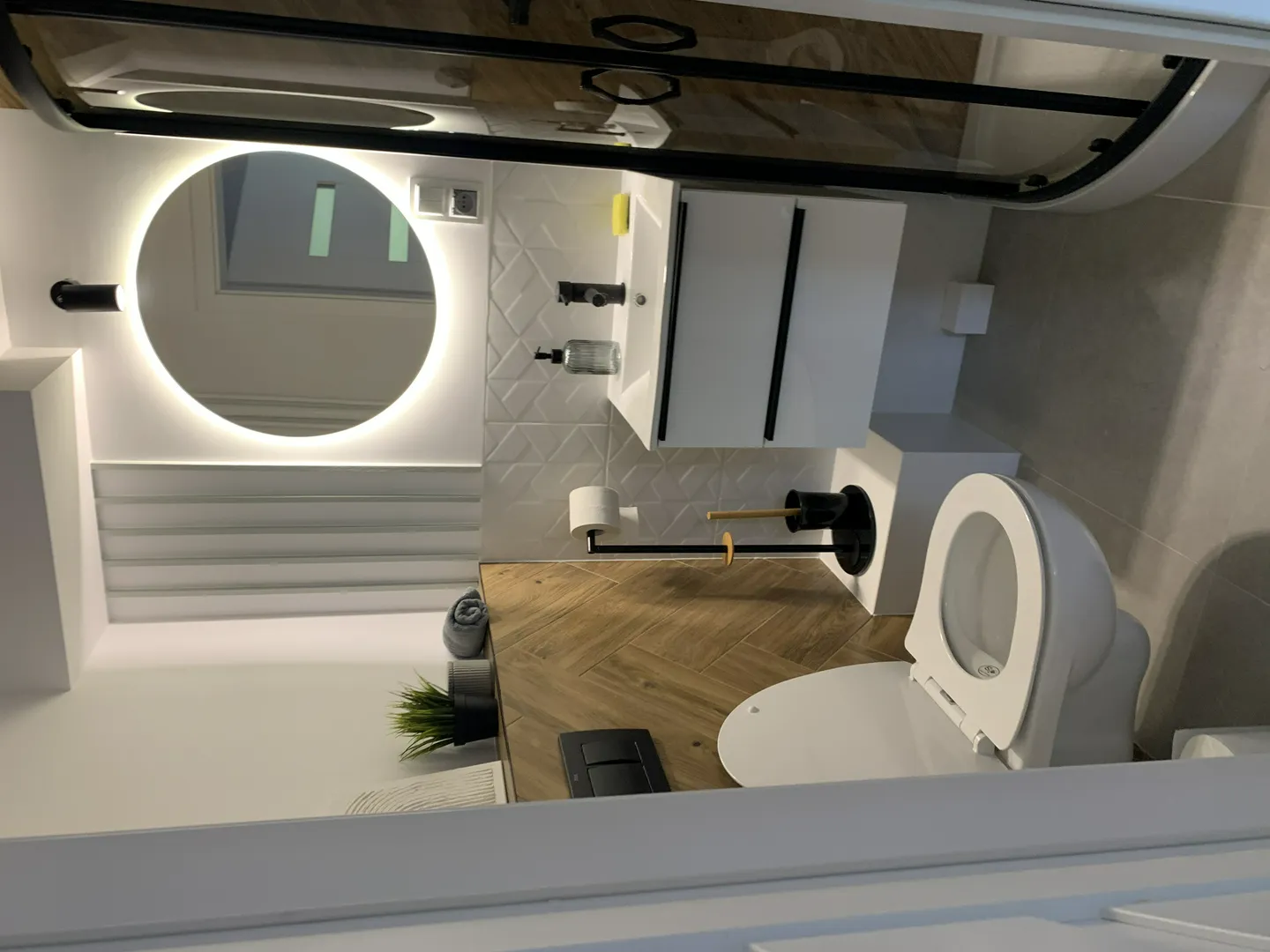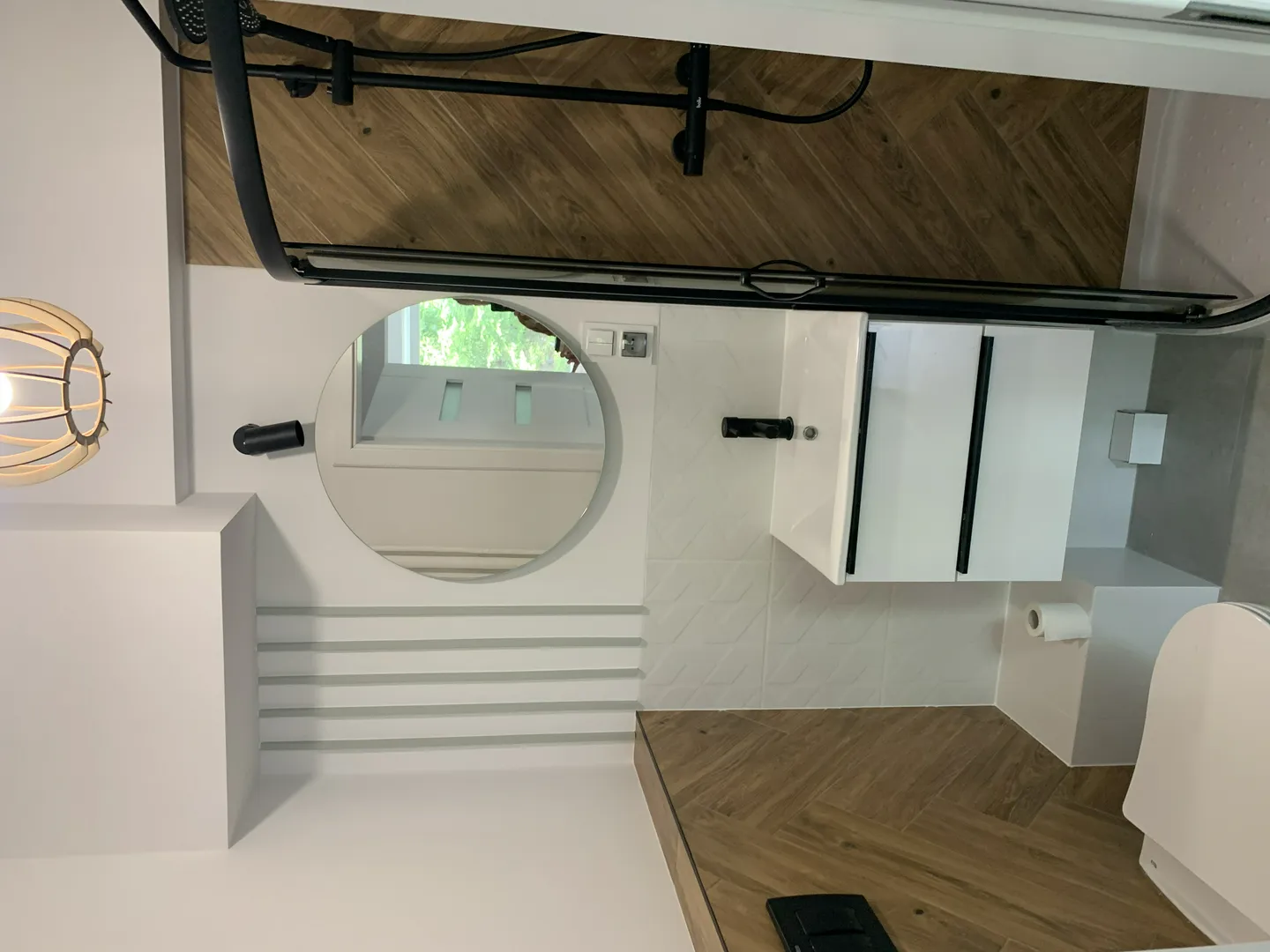 Wykończenie łazienek – płytki drewnopodobne, brodzik z parawanem, armatura